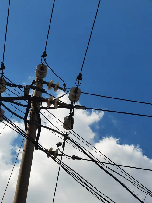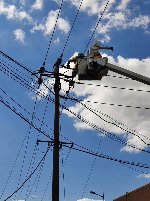 2024年9月22日,勝園供電所市區(qū)線工商局支線02號桿帶電處理中項導線放電故障,絕緣包裹導線及金具。下面是施工現(xiàn)場: